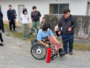 避難訓練を行う目的ですが、まずは利用者の方々が、避難方法を正しく理解した上で、出来る限り自分で安全に避難出来るようにすることが挙げられます。避難訓練は職員主導ですが、消火器の操作訓練には利用者も参加する等、避難訓練を出来るだけ身近なこととして捉え、主体的に関わってもらえるようにしています。